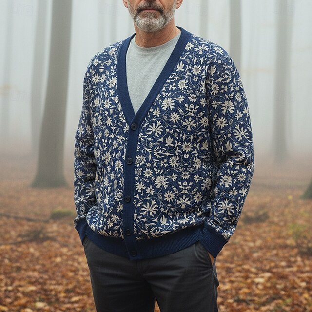 HOT ! Christmas Men's Ditsy Floral Flower / Plants Sweater Cardigan Sweater V Neck Retro Vintage Casual Outdoor Home Party Buckle Long Sleeve Fall Winter Blue Ink Blue