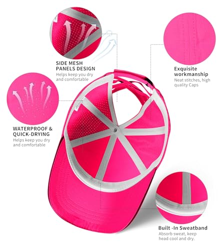 • 【Elastic Bands Criss Cross Reflective Ponytail Hat】 - The mesh back design can let the air flow and heat volatilize better, giving a comfortable wearing experience. These girls' baseball cap features a specially designed unique criss cross elastic bands, making it perfect for messy buns or ponytails. The girls' sports cap has a reflective strip on the edge of the brim, which can effectively improve the visibility in low light situations and improve safety.