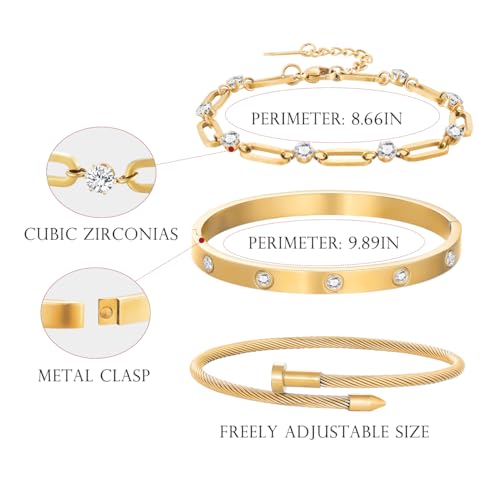 • Material&Measurement: The bangle bracelet has a diameter of 3.15''. 8.66'' cubic zirconia link bracelet and open twisted wire nail bracelet, you can easily adjust the length by yourself to fit your wrist size. Stainless steel with 18K gold plated bracelet is wear-resistant, stays long-lasting shiny and hypoallergenic so you can wear it for years.