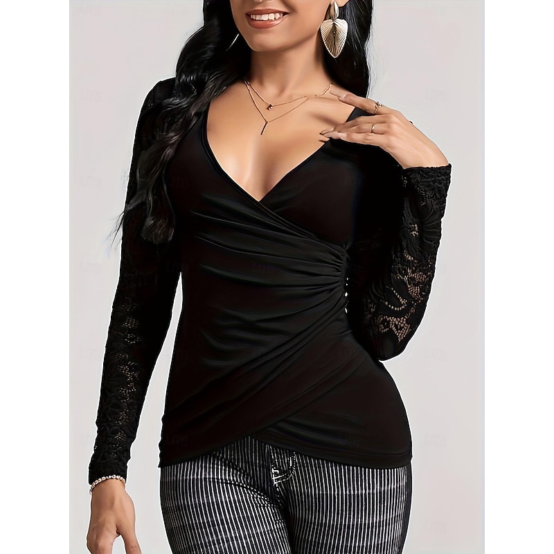 Highlights [Fabric] : Crafted from a high-quality rayon blend, this women’s blouse offers a standard thickness with micro-elasticity for a comfortable and flexible fit. The breathable material ensures a versatile wear through the cooler months of spring and fall, providing ease of care with machine washability. [Fit and Style] : Designed in a contemporary fashion-forward style, this blouse presents a regular fit that gently follows the body's natural curves while allowing freedom of movement. The plain black design adds an understated elegance, making it a staple piece in any wardrobe. [Design Highlights] : The blouse showcases a striking deep V-neckline that enhances its sophisticated appeal. The long sleeves feature intricate black lace with delicate floral patterns, creating a captivating contrast against the solid black body. This design element elevates the overall look with a subtle yet effective touch of femininity and elegance. [Occasions] : Ideal for street style and daily wear, this versatile blouse transitions seamlessly from casual to dressier occasions. Pair it with jeans for a relaxed outing or team it with a skirt for a more polished look, making it suitable for various settings such as urban street walks, brunch dates, or evening gatherings. [Size Range] : Available in sizes S, M, L, XL, and XXL, the blouse caters to a range of body types, offering a flattering fit for everyone.