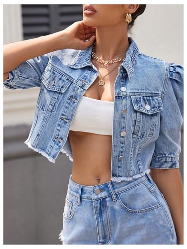 More information about WDIRARA Women's Button Down Puff Sleeve Crop Denim Jacket Short Sleeve Raw Hem Jean Coat