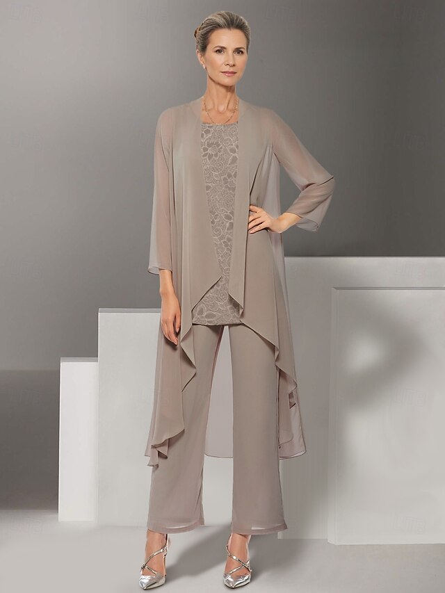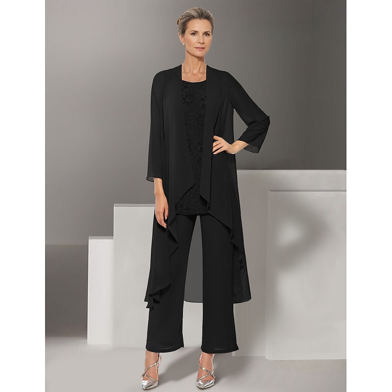More information about Pantsuit 3 Piece Mother of the Bride Dress Beach Wedding Elegant Jewel Neck Floor Length Chiffon Long Sleeve Wrap Included with Lace Solid Color