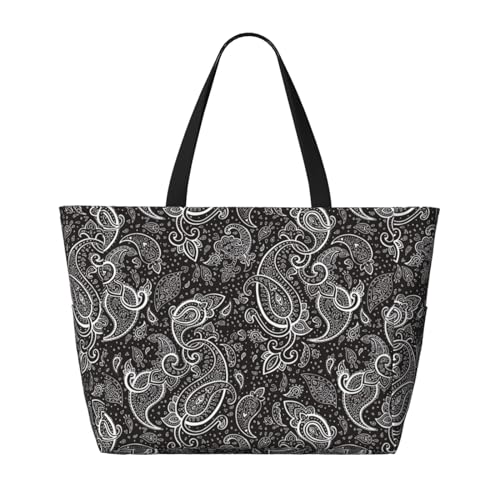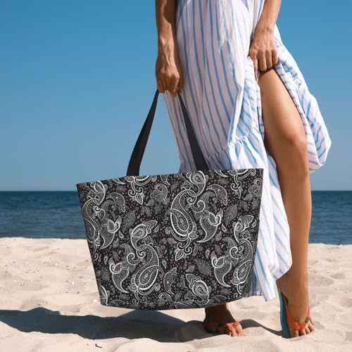 Black Paisley Large Beach Bag Waterproof Sandproof Swim Tote Pool Bag For Women With Zipper