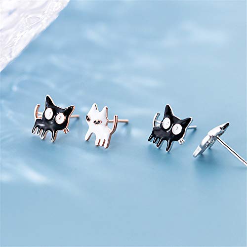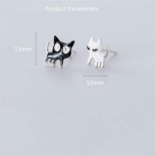 HOT ! Asymmetrical Black White Cat Earrings for Women Girls 925 Sterling Silver Enamel Cats Kitten Cute Animal Small Studs Earring Hypoallergenic Lovely Jewelry Gift for Pet Lover