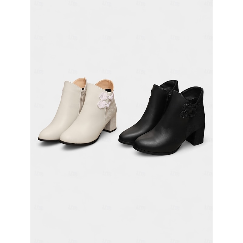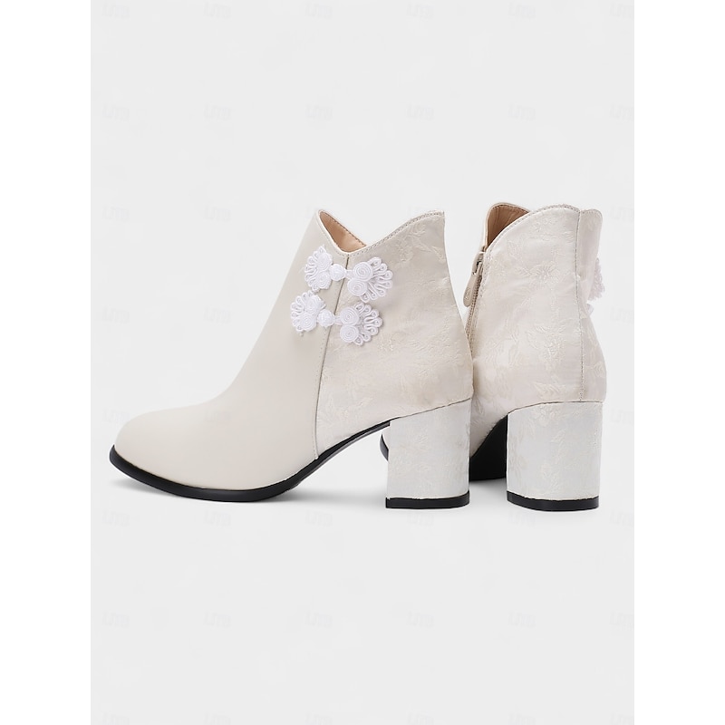Women's White Faux Leather Ankle Boots with jacquard and Block Heel – Stylish Winter Short Booties for Ladies, Ideal for Holiday Parties, Outdoor Wear & Casual Street Style 12