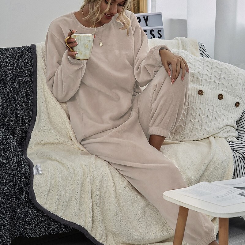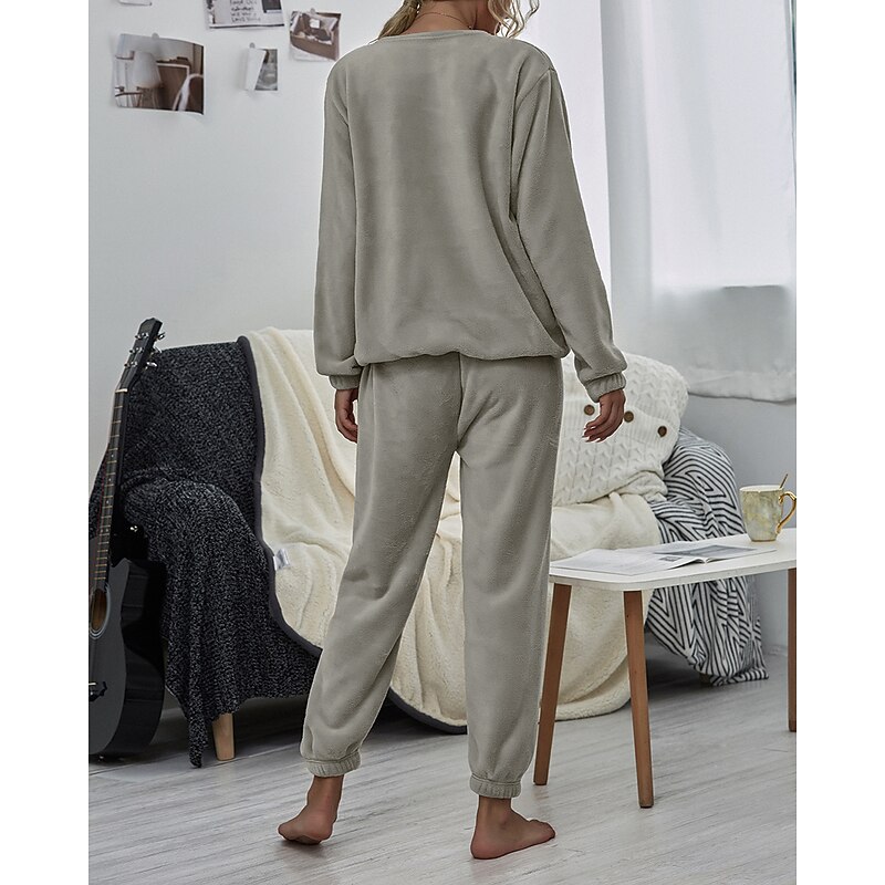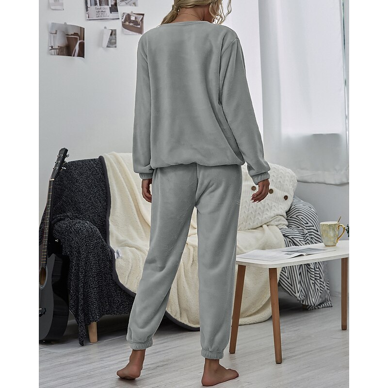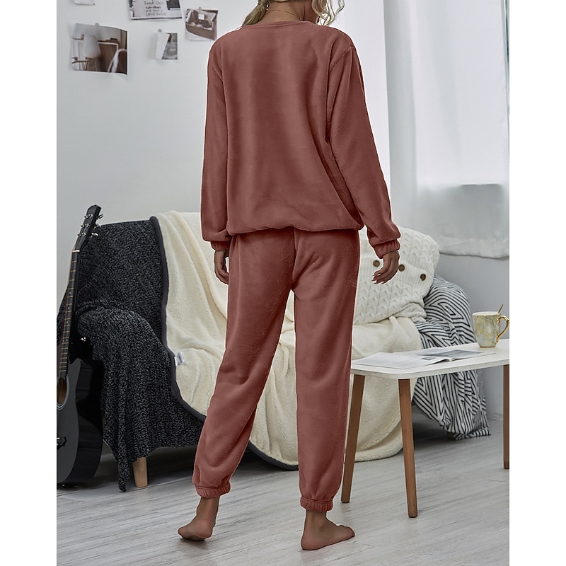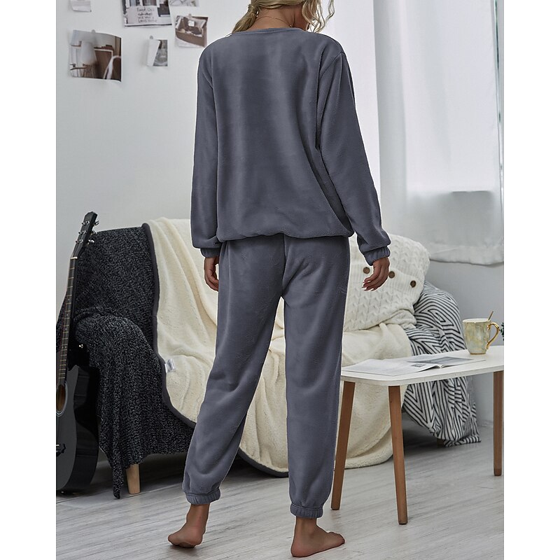 : Crafted from a luxurious blend of polyester and fleece, this women's loungewear set offers a plush, soft-to-the-touch feel. The high-quality fleece material ensures exceptional warmth and comfort, making it ideal for relaxing days at home.