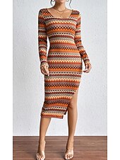 Highlights [Fabric:] Crafted from premium polyester, this dress offers a soft texture with inelastic properties, ensuring both comfort and durability. The material is easy to care for, recommended to be washed separately inside out with similar colors. [Style and Fit:] Designed with a loose fit silhouette, the dress provides a flattering and comfortable wear, suitable for a variety of body types. The midi length gives it a timeless appeal, while the form-fitting nature accentuates the figure in a sophisticated way. [Design Highlights:] This dress features a vibrant Aztec pattern in shades of orange, brown, and cream, creating a striking ethnic-inspired look. The elegant crew neck balances the graphic design, and the asymmetrical hemline with a slit injects modern flair. Long sleeves complement the overall design, offering a balanced appearance perfect for the transitional seasons. [Occasions:] Perfect for holiday getaways, daily outings, or even semi-formal settings, this dress is versatile enough to suit various occasions. Its retro yet elegant style makes it an ideal choice for those looking to make a chic statement. [Size Options:] Available in sizes S, M, L, and XL, this dress caters to a wide range of preferences, ensuring you find the perfect fit for your wardrobe.