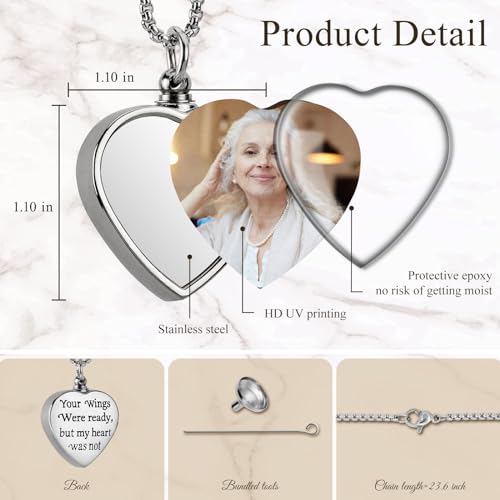 • Premium Quality:Urn necklaces for ashes made of Stainless Steel. It will never rust, corrode, rust or stain. We use UV printing technology to print the picture and cover it with special transparent material. The picture will be very clear, never peed off and fade, no matter how long it takes. Perfect for commemorating loved ones