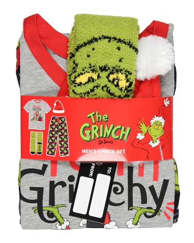 Dr. Seuss The Grinch Men's Feelin Grinchy 4-Piece Adult Holiday Lounge Sleep Gift Set with Pants T-Shirt Hat Socks 6